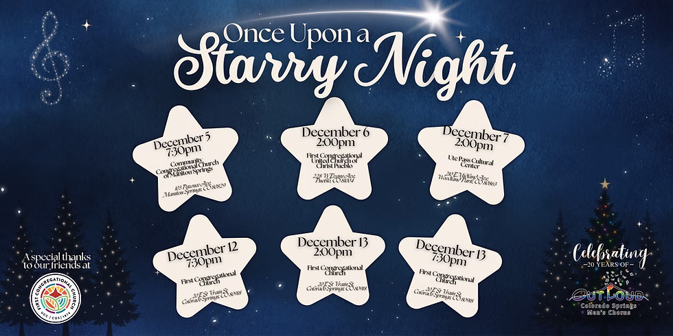 Join us as Colorado Springs Out Loud Men's Chorus proudly enters our 20th anniversary season with Once Upon a Starry Night. This concert weaves together heartfelt harmonies, joyful energy, and the magic of the season, inviting you to celebrate two decades of community and song. Come be part of the story as we honor our past and sing into the future!
